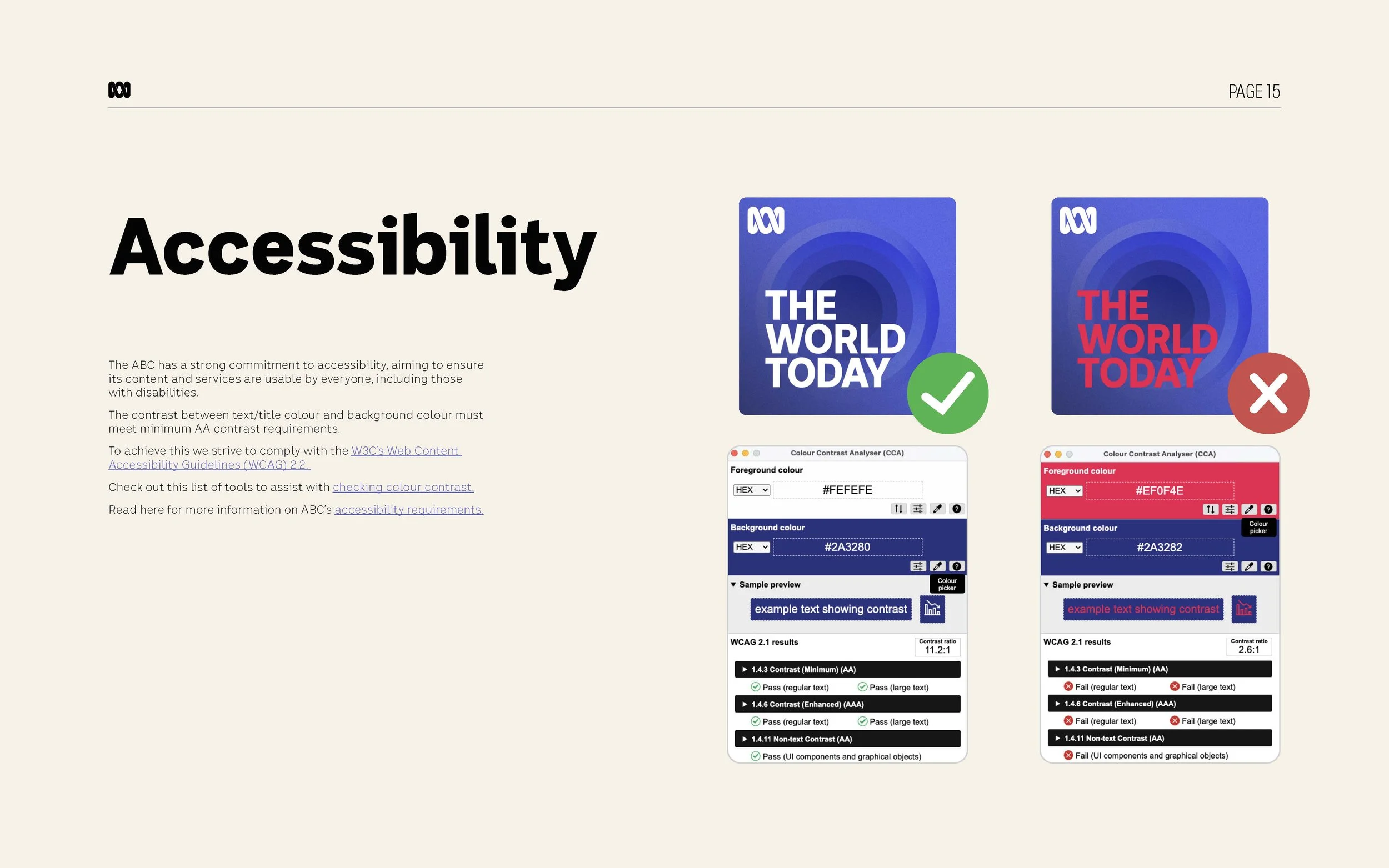 ABC has a strong commitment to accessibility, ensuring its content and services are usable by everyone, including people with disability. This guide was developed with accessibility embedded from the outset, providing clear pathways to the Web Content Accessibility Guidelines, ABC’s Accessibility Hub, and practical tools for checking colour contrast.